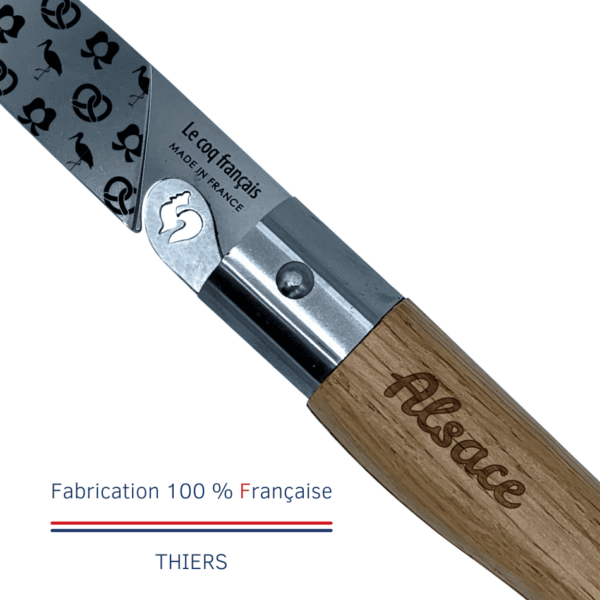 Ce couteau pliant incarne les engagements du Coq Français pour la fabrication locale et artisanale, en hommage à la riche tradition et au patrimoine Alsacien.
