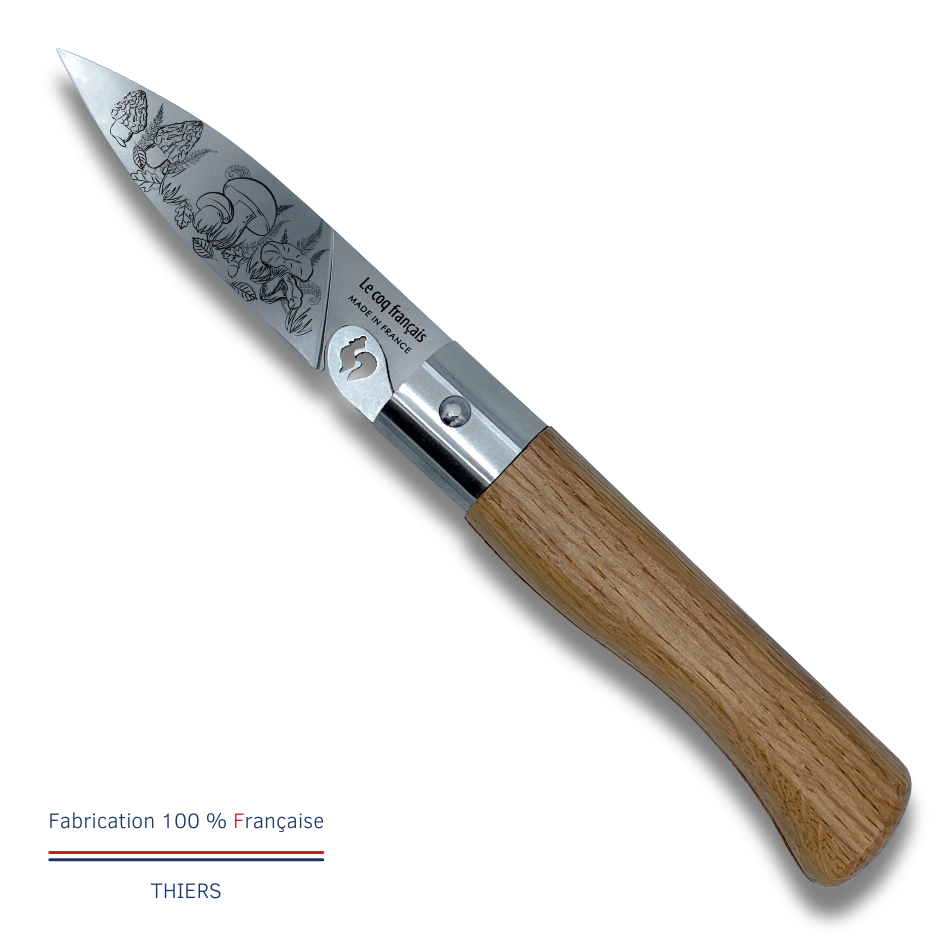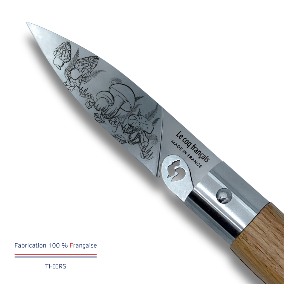 Ce couteau de poche se distingue par un design raffiné où un coq et des champignons sont finement gravés sur la lame, symbolisant la fierté et la richesse de nos sous-bois sauvages. La lame, ornée de ces motifs naturels, offre à la fois élégance et performance. Le manche, simple et épuré, met en valeur la beauté de la lame sans distraction, permettant à l’artisanat de briller. Pensé pour une prise en main confortable et ergonomique, ce couteau incarne un savoir-faire artisanal respectueux des traditions tout en apportant une touche de raffinement naturel.