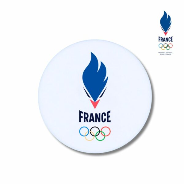 Chaque élément de ce trio arbore le logo de l’équipe de France Olympique. Ce nouvel emblème représente un coq conquérant de face dont la crête se transforme en flamme olympique.